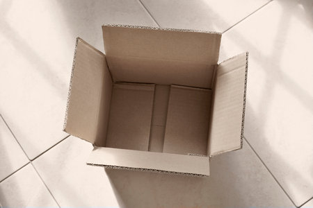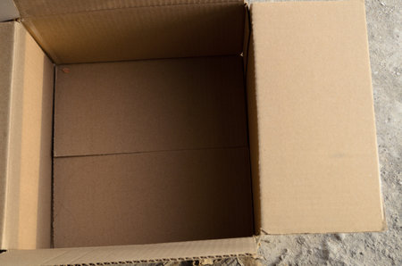 An opened empty brown cardboard box on the floor, e-commerce of packaging