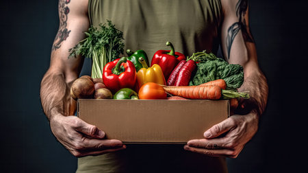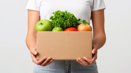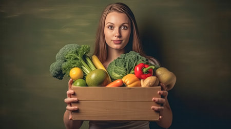 woman holding a box of fruits and vegetables, conveying the concept of food donation or store delivery. A powerful symbol of generosity and strength.