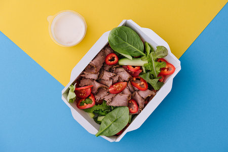Business lunch in eco plastic container ready for delivery.Top view. Office Lunch boxes with food ready to go. Food takes away. Catering, brakfast. Generative AI