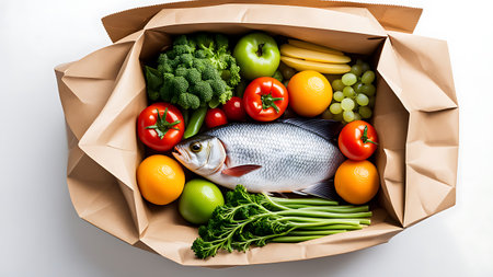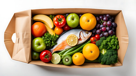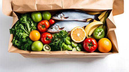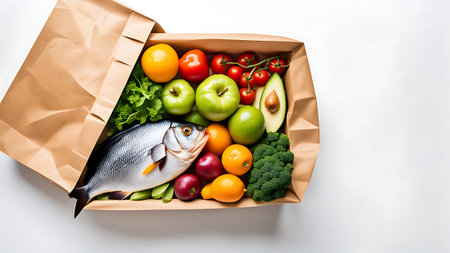 A paper box filled with fresh fish, colorful vegetables, and fruits, showcasing a vibrant and healthy meal.