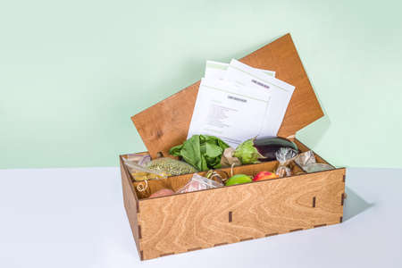 Woman put on the table food box meal kit of fresh ingredients order from a meal kit company, delivered, cooking at home.