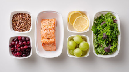 A beautifully arranged selection of fresh ingredients for a nutritious meal. Featuring grilled salmon, vibrant greens, juicy fruits, and aromatic spices.