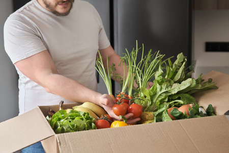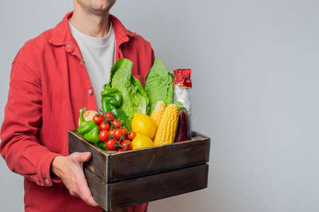 Home delivery during an epidemic. contactless delivery. Food donation. Mens hands hold a box with products.