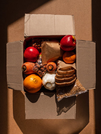 Healthy food delivery flat lay harsh shadows. Take away natural organic products package. Donation box New normal online shopping safe delivery concept. Fruits vegetables carrot apple grains bread nut