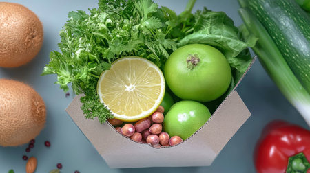 A cardboard box filled with fresh organic vegetables and eggs on a light blue background, showcasing a vibrant and healthy food delivery option.