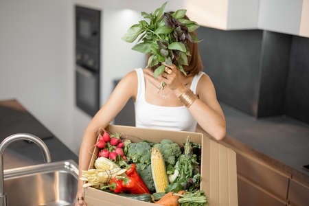 Young woman with fresh vegetables packed in cardboard box at kitchen. Delivering and buying food online, healthy eating and organic food concept