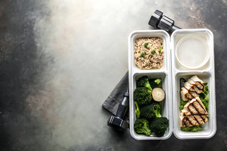 A top-down view of a compartmentalized meal prep box filled with grilled chicken, steamed broccoli, brown rice, and sliced carrots, offering a balanced and nutritious meal.