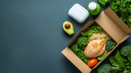 Fresh healthy food in a delivery box. Ready to eat.