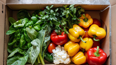 Fresh grocery delivery left at a customers doorstep, filled with colorful bell peppers, greens, and dairy products