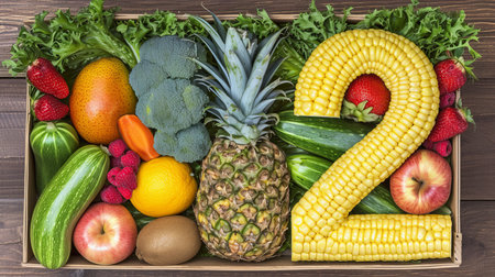 Number 2 made of fruits and vegetables isolated on white background, in flat lay style top view