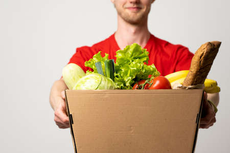 Food delivery service. Portrait of pleased delivery man in red uniform smiling while carrying paper box with food products isolated over white background.