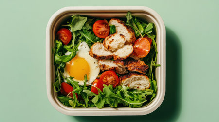 This image showcases a vibrant vegetarian lunch box filled with fresh ingredients, including boiled eggs, cherry tomatoes, and colorful salads. Perfect for health-conscious diners seeking a delicious and nutritious meal option.
