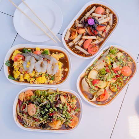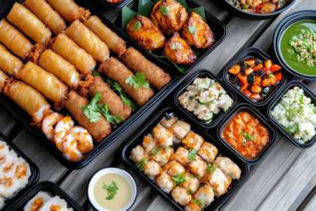 Worldwide street food assortment, freshly served and appetizing. AI generated.