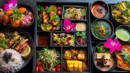 A vibrant assortment of Asian dishes beautifully arranged in a gourmet platter, featuring fresh ingredients, colorful garnishes, and exquisite presentation.