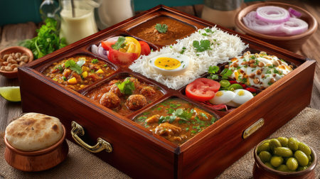 Explore a vibrant wooden tray filled with an assortment of delicious Indian dishes, including curry, rice, and fresh vegetables, perfect for sharing.