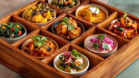 This striking image showcases a wooden tray filled with nine assorted Indian dishes, highlighting vibrant colors and rich textures. Each bowl represents a unique culinary experience, combining traditional flavors and fresh ingredients, perfect for food lovers and cultural enthusiasts.