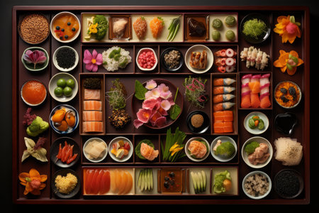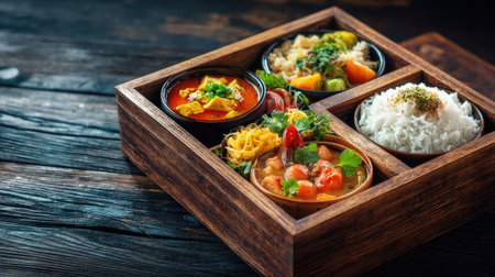 A beautifully crafted wooden bento box filled with fresh, healthy ingredients, each element thoughtfully placed
