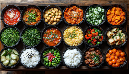 An overhead view of diverse, colorful meal boxes, arranged neatly on a wooden table
