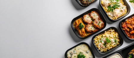 Assorted takeaway meals in black containers on white background. Top view, empty space for text