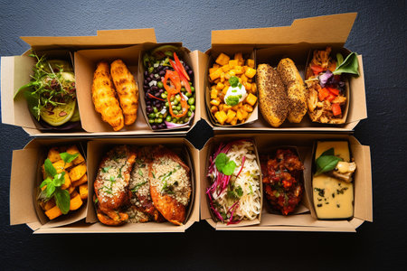 Various types of food packed in boxes, creating a delightful array of flavors and cuisines., Restaurant healthy food delivery in take away boxes, AI Generated, AI Generated