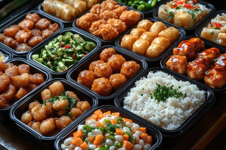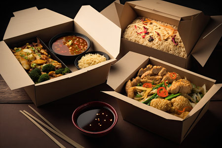 Closeup view of various chinese dishes in takeout containers, ready for delivery