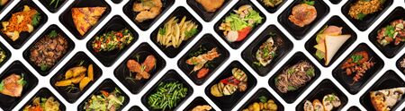 Collection Of Different Tasty Meals In Black Plastic Containers Over Grey Background