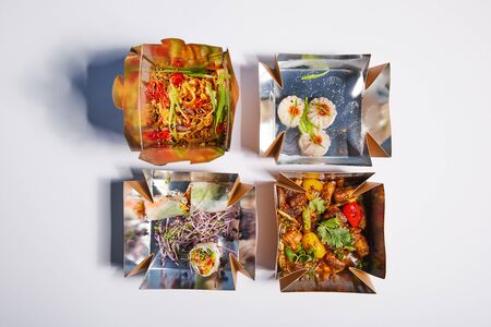 wok food, meat and noodles into four paper boxes, flat lay. Zero waste