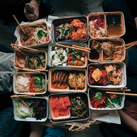 A vibrant display of diverse takeout meals in a restaurant window, showcasing a variety of flavors and culinary options in an urban setting.