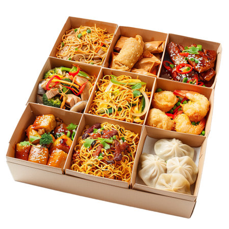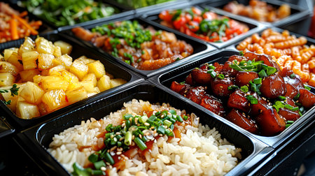 Close-up view of catering boxes filled with delicious Asian food