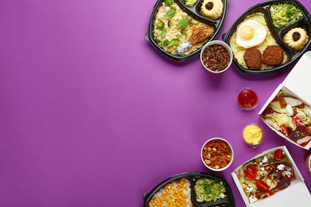 Top view of food containers with different meals on white background. Food delivery concept