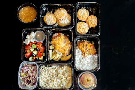 Business lunch in eco plastic container ready for delivery.Top view. Office Lunch boxes with food ready to go. Food takes away. Catering, brakfast.