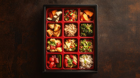A vibrant bento box showcasing a delightful assortment of Asian foods featuring various vegetables, proteins, and rice, perfect for a satisfying meal.