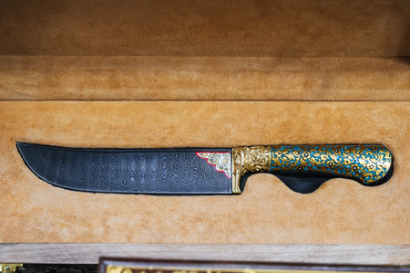 traditional oriental Uzbek knife made of Damascus steel in a wooden gift box in souvenir shop in Uzbekistan