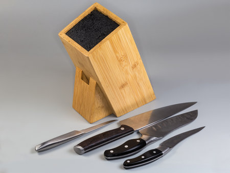 Inclined wooden stand made with natural bamboo bar with a removable plastic bristle insert for kitchen knives and several knives on a foreground on a gray background