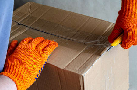 A worker wearing protective gloves opens a cardboard box. A hand with a knife cuts the adhesive tape on the package. Logistics and delivery service. Selective focus.