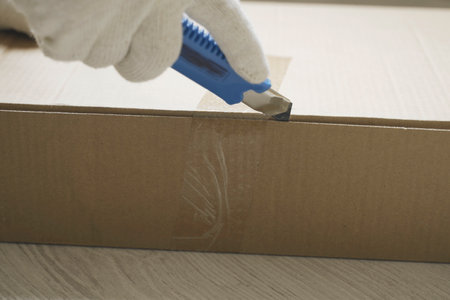 Unboxing the courier box with a cutter knife