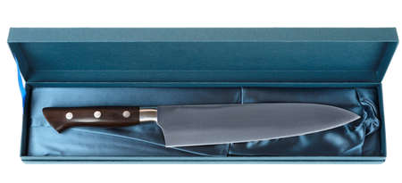 Japanese chef's knife in blue gift box, isolated, never used