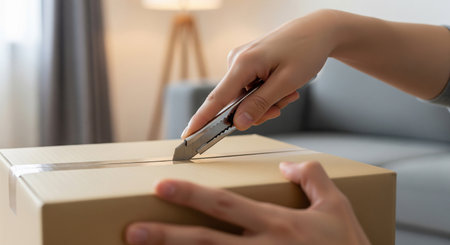A close-up view of a sharp knife cutting through the top of a cardboard box, illustrating the unboxing process in a warm and inviting workspace setting.