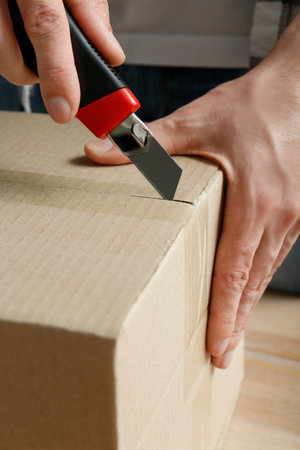 Man using utility knife to open parcel, closeup