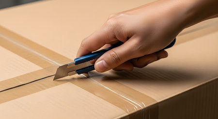 A close-up shot of a hand holding a blue utility knife and cutting the tape on a cardboard box. The action suggests unboxing, receiving a package, or moving.