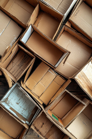 A creative and abstract arrangement of brown cardboard boxes in various sizes creates an interesting background texture suitable for artistic and design projects.
