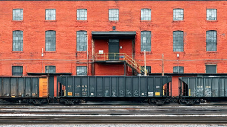 Freight train cars standing on railroad tracks in front of a vibrant red brick industrial building with numerous windows, a loading dock, and metal stairs, symbolizing urban industry and logistics