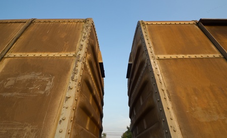 Yellow and brown wagons of a freight train. Railway in Russia. High quality photo