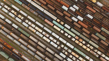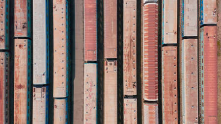 Aerial view of freight trains. Railway cargo wagons with goods on railroad. Top view of colorful freight train on the railway station. Heavy industry. Industrial scene. Transportation