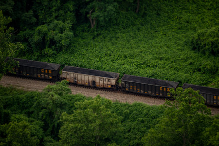 Aerial drone view of a freight train at a railway station, showcasing industrial transport infrastructure with steel tracks and cargo carriages. Ideal for logistics themes.