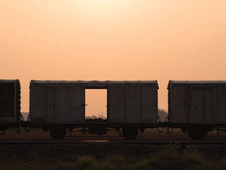 Railcar for dry cargo during beautiful sunset and colorful sky, railroad infrastructure, transportation and industrial concept