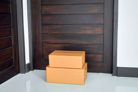 A parcel box placed at the front of the door. Quarantine, contactless delivery during a pandemic covid. Stay at home, Online shopping.