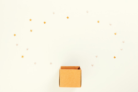 Open brown vintage empty box on white background, holiday and event concept. Copy space for text