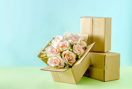 White flowers in brown gift cardboard box on blue background. Flower delivery. Minimal concept.