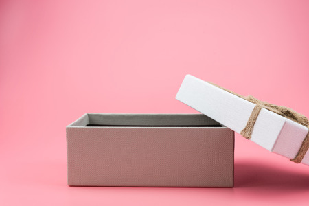 White gift box, ribbon bundle, cotton rope, placed on pink background.